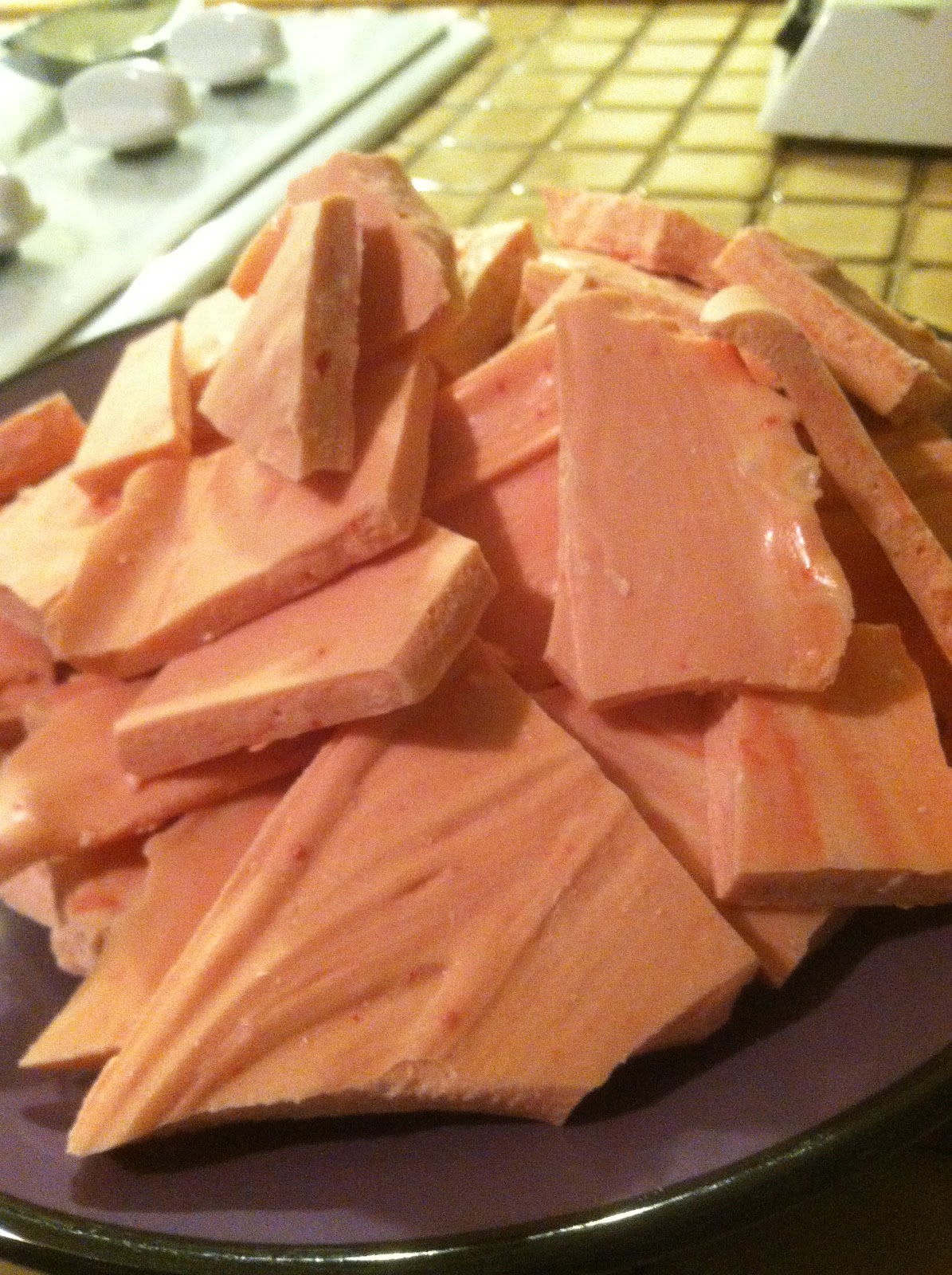 (If you are not up for crushing candy canes they now come in handy dandy bags, already crushed. I think it turned my bark pink and didn't quite give that satisfying crunch, but it works just the same )